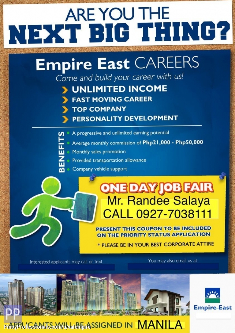 HIRING TODAY! REAL ESTATE AGENT Empire East Land Holdings Inc. (Sales and Marketing related job) MUST BE College Graduate (any course) 2 years or 4 years graduate MUST BE