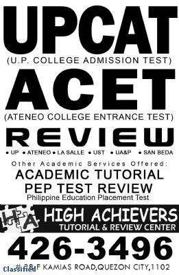 For entrance test schedule and requirements pls. visit www.dhighachiever.multiply.com dhighachievers /Mar 20, 2010 permalink reply (0)College Entrance Exams (UPCAT, ACET, LSAT, etc) REVIEW only P 5,500! 09272872734, 5128092, preparereview@yahoo.com