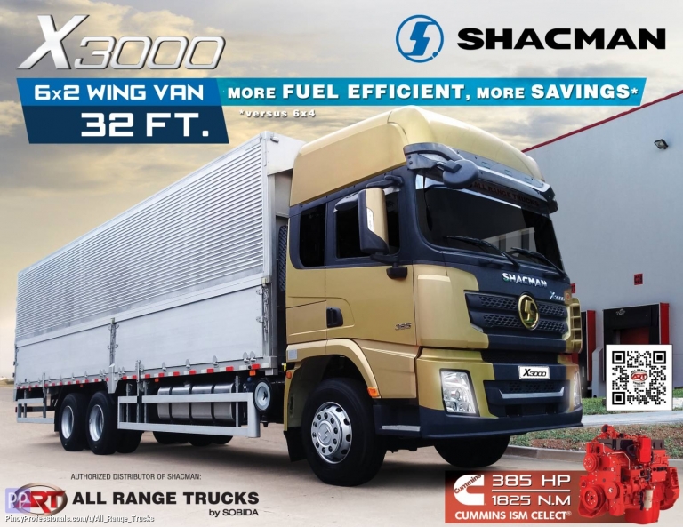 Shacman X3000 SX1256XXY4T583C 11-liter CUMMINS ISM CELECT 6-cylinder turbocharged Euro-4 Diesel engine, 385 horsepower, 1,825 N-m torque, 12-speed manual transmission, 10-wheeler 6x2 rear wheel drive, 600 liter aluminum fuel tank, 430 mm diameter EATON clutch, SHACMAN-Hande Axles, 12R22.5 (10+1) tires with rim trim cover, multi-leaf spring suspension, WABCO braking technology, length: 12,250 mm, width: 2,550 mm, height: 3,960 mm, wheelbase: 6,975 mm + 1,400 mm, Gross Vehicle Weight: 40,000 kgs, Curb Weight: 12,000 kgs, 32-footer wing van, high roof, double sleeping beds, four-point hydraulic suspension, air conditioning system, Grammer air suspension driver seat, Fleetguard air filter, electrical cab reversal, central door locks, electric heater side mirrors, SHACMAN telematics; 12-months unlimited mileage new vehicle warranty.