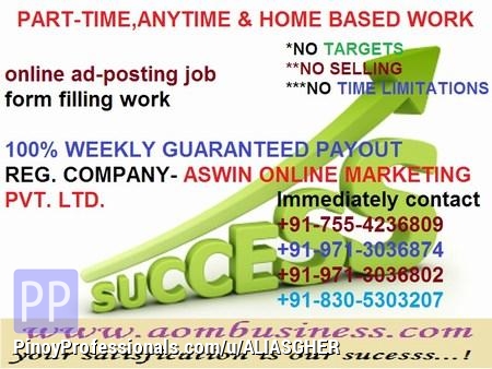 · WORK FROM HOME THROUGH INTERNET IN PART-TIME & EARN UPTO RS.4500 TO 18000+ PER MONTH. · ONLINE BUSINESS OPPORTUNITY, ONLINE WORK FROM HOME JOB. · MANAGE YOUR TIME DAILY TO GET POCKET HOT ALWAYS, WORK FROM HOME, CYBER CAFÉ OR OFFICE BY USING COMPUTER; MAKE WEEKLY INCOME TO YOUR HOME, ENCHANCE YOUR LIFESTYLE. · IT IS AN OPPORTUNITY TO BUILD EXTRA MONEY FROM ANYWHERE, ANYLOCATION OR ANYTIME. · NO SELLING - NO MARKETING - NO TIME LIMITATION - NO TARGET-AS WELL AS NON-STRESSABLE WORK. · 100% WEEKLY GUARANTEED PAYOUT IF YOU’RE DEDICATED TO CHANGE STATUS. · CANDIDATE AD POST ID NO.:-1330 · CONTACT:-+91-755-4236809, +91-9713036805/874/802 · REG. COMPANY - ASWIN ONLINE MARKETING Pvt.Ltd. · SERVICE AVAILABLE 24/7 · VISIT:-www.aombusiness.com or mail us: info@aombusiness.com